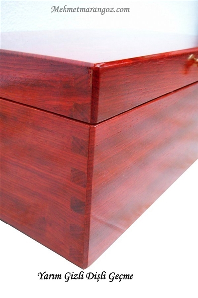 12 mm İspanyol sedir ağacı üzerine 6 mm Paduak Ağacı lamine edilerek Yarım gizli dişli geçme tekniği kullanarak yapılmış orta boy puro kutumuz el işçiliğinin güzel bir örneğidir. Ön taraftan bakıldığında ön panel bütün yan taraftan bakıldığında köşe birleştirmelerde dişli geçmenin zarafetini görebiliriniz. Paduak Ağacı Afrika kökenli bir ağaçtır. Dragon ağacı, paduk ağacı ve kan ağacı olarak adlandırılır.Ürünümüz Tamamen el işçiliğidir. |