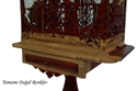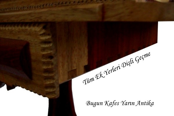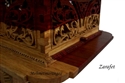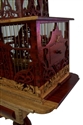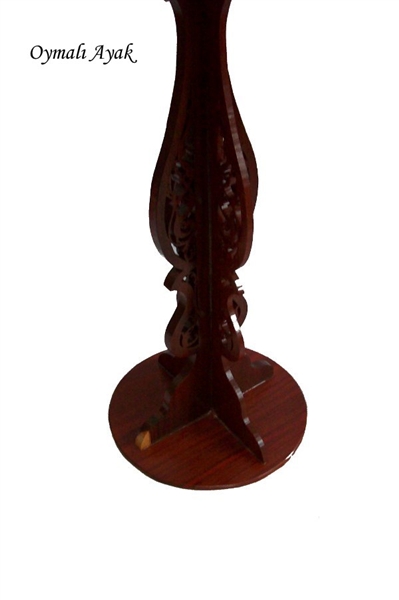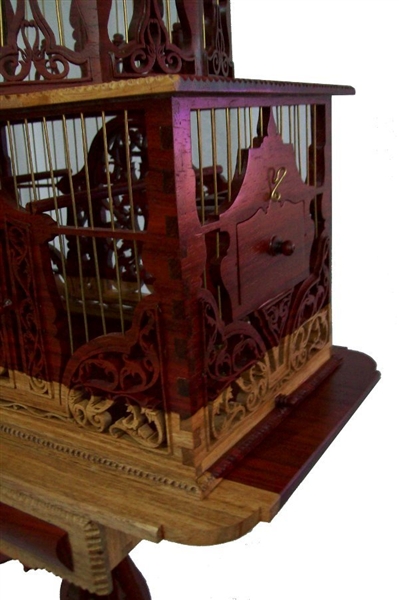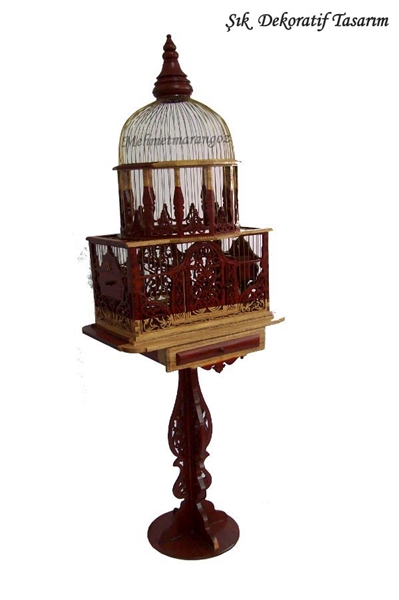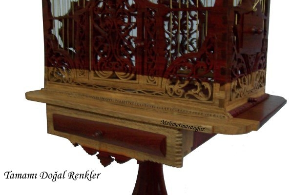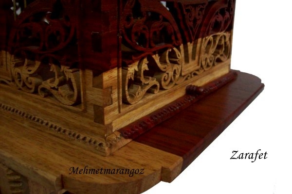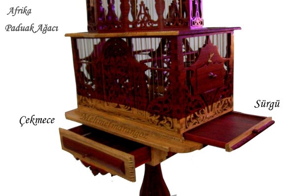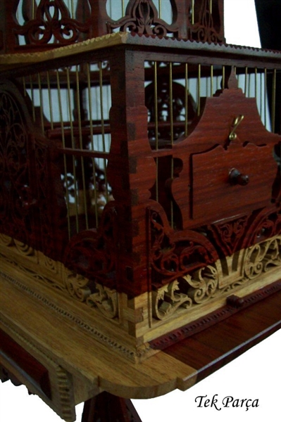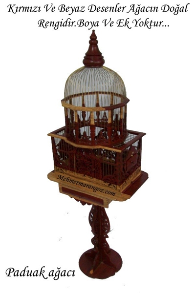 Paduak Ağacından yapılmıştır.Kan Ağacı ve dragon ağacı olarak bilinen Afrika kökenli bir ağaçtır.Üzerinde yoğun el işçiliği kullanılmış olup kıl testere ile oyma sanatı uygulanmıştır.Kafes üzerindeki kırmızı ve beyaz renkler ağacın orijinal dokusudur.Hiç bir boya ve ek yapılmadan yekpare ağaçlardan dizayn edilmiştir. |