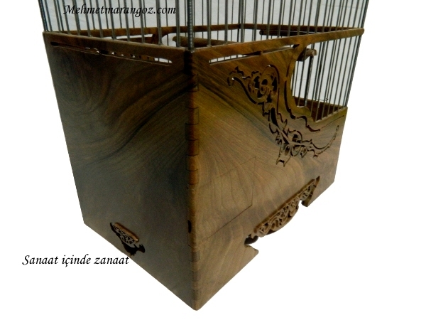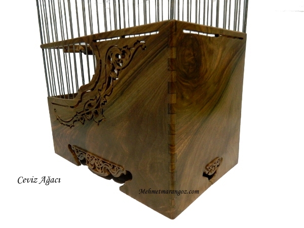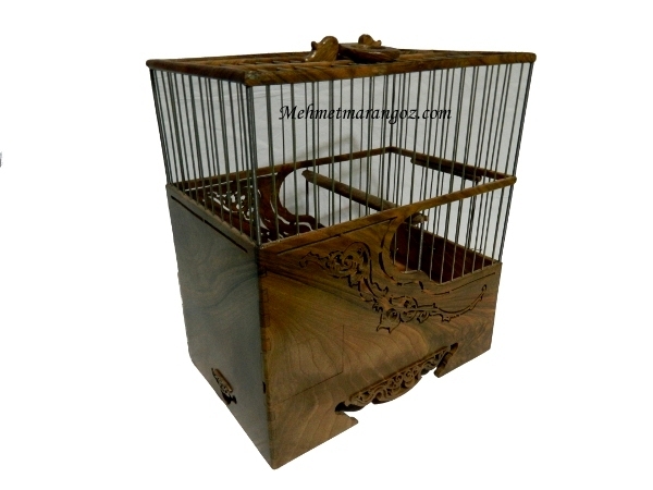 Ceviz Ağacından yapılmış olan bu kafesimiz. El oyma işçiliğinin güzel bir örneğidir. Yapımı 6 gün sürmüş olan bu kafesimizde lale motifleri işlemiştir.hiç bir makina yardımı olmadan kıl desteresi ile elde oyularak yapılmıştır.