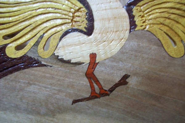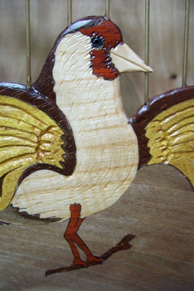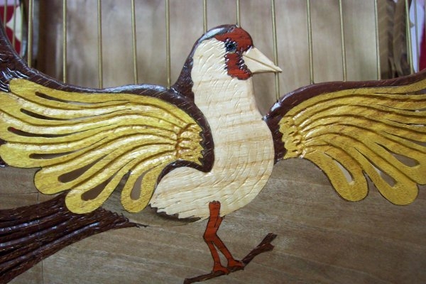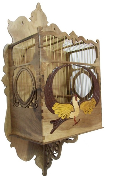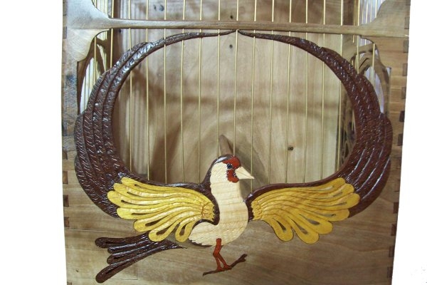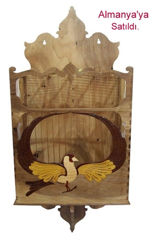 Kafesi oluşturan ana kasa Ceviz ağacıdır. Kafes üzerindeki kuş işlemesi tamamen Tabiatın ağaçlara verdiği renklerdir. Kuş motifini oluşturan kanat uçları, kuyruk ve ayakların altındaki dal’daki kahverengi malzeme Venge ağacı, kanatlardaki Sarı malzeme Dut ağacı, gövdedeki ve gaga’daki Beyaz malzeme Dış budak ağacı, Yüz ve ayaklardaki Kırmızı malzeme Gül ağacı dır.Kafeste Hiçbir makine gereci kullanılmadı. Ve Kafes üzerindeki kuş işlemesinde hiçbir boya ve benzeri unsur yoktur. Tamamen el işçiliği ile 5 farklı Ağaç çeşidi kullanılarak icra edilmiştir. |